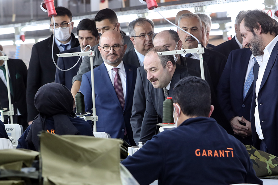 Bakan Varank, açılış törenleri ve çeşitli temasları dolayısıyla gittiği Yozgat’ta, Garanti Giyim Kompozit Teknolojileri Fabrikası’nın vücut ve araç zırhları ile tekstil, balistik ve kompozit malzemeler üretim hatlarında incelemelerde bulundu.