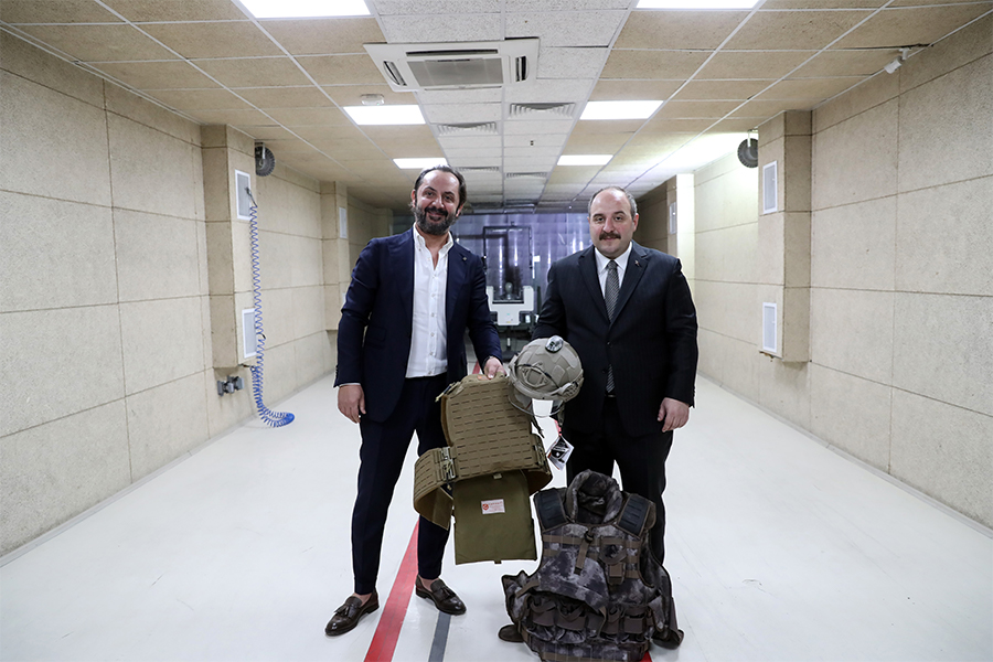 Üretim tesisi içerisindeki test atış tünellerinde 7.62 milimetre balistik mühimmat ile 15 metre mesafeden yelek ve kaska atış yapan Varank, daha sonra ekipmanların atış sonrası durumunu inceledi.